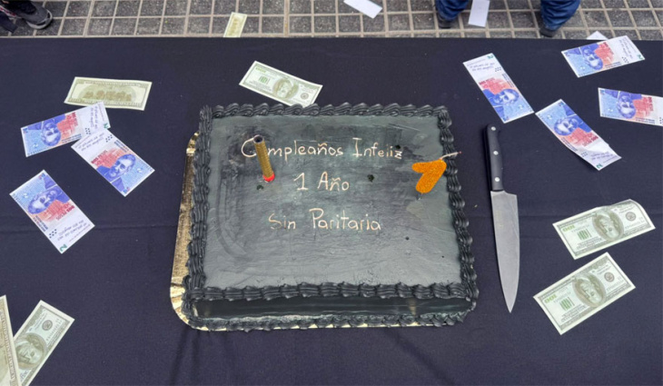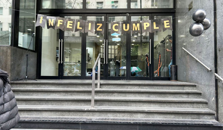 La protesta se realizó con un acto simbólico frente a la Casa Central de Vialidad Nacional, donde trabajadoras y trabajadores “celebramos con una torta negra y billetes de dos pesos con la cara del Administrador General, Marcelo Campoy”, para visibilizar “la pérdida de valor de nuestros salarios, tras un año de congelamiento y ajuste”.