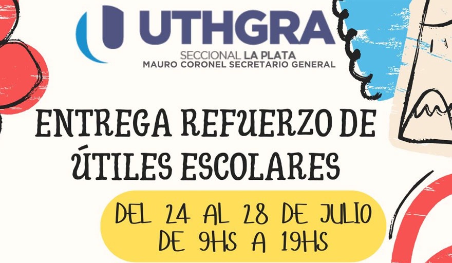 UTHGRA La Plata informó que hasta el 28 de julio, en el horario de 9 a 19, se entregan los refuerzos de útiles escolares para hijos de sus afiliados y afiliadas.