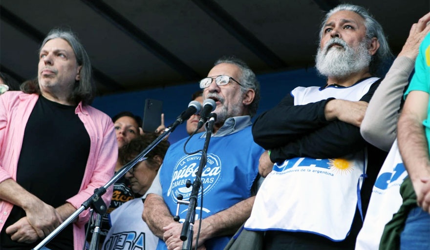 “Y esta universidad que en 40 años de democracia supo construir fortaleza, hoy está en peligro. Como está en peligro todo el Estado argentino. Porque una pandilla de facinerosos dice que hay que terminar con el Estado, que hay que terminar con la Argentina”, alertó el directivo sindical.